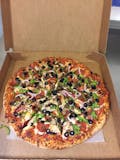 Pepperoni, mushrooms, red onions, green peppers, black olives, and sausage.